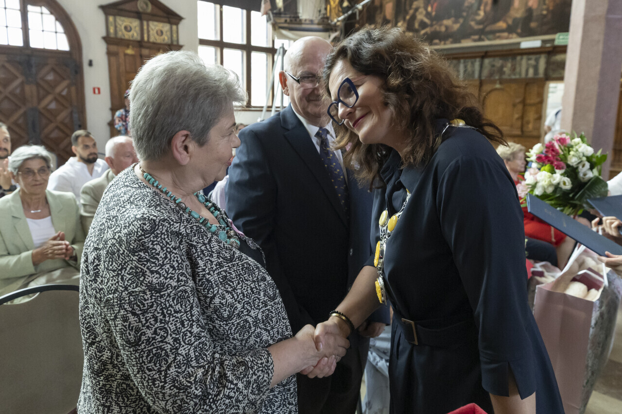 Gdańsk. Dwór Artusa. Jubileusz Par Małżeńskich - Złote Gody, podczas których Prezydent Gdańska Aleksandra Dulkiewicz wręczyła medale za długoletnie pożycie małżeńskie.