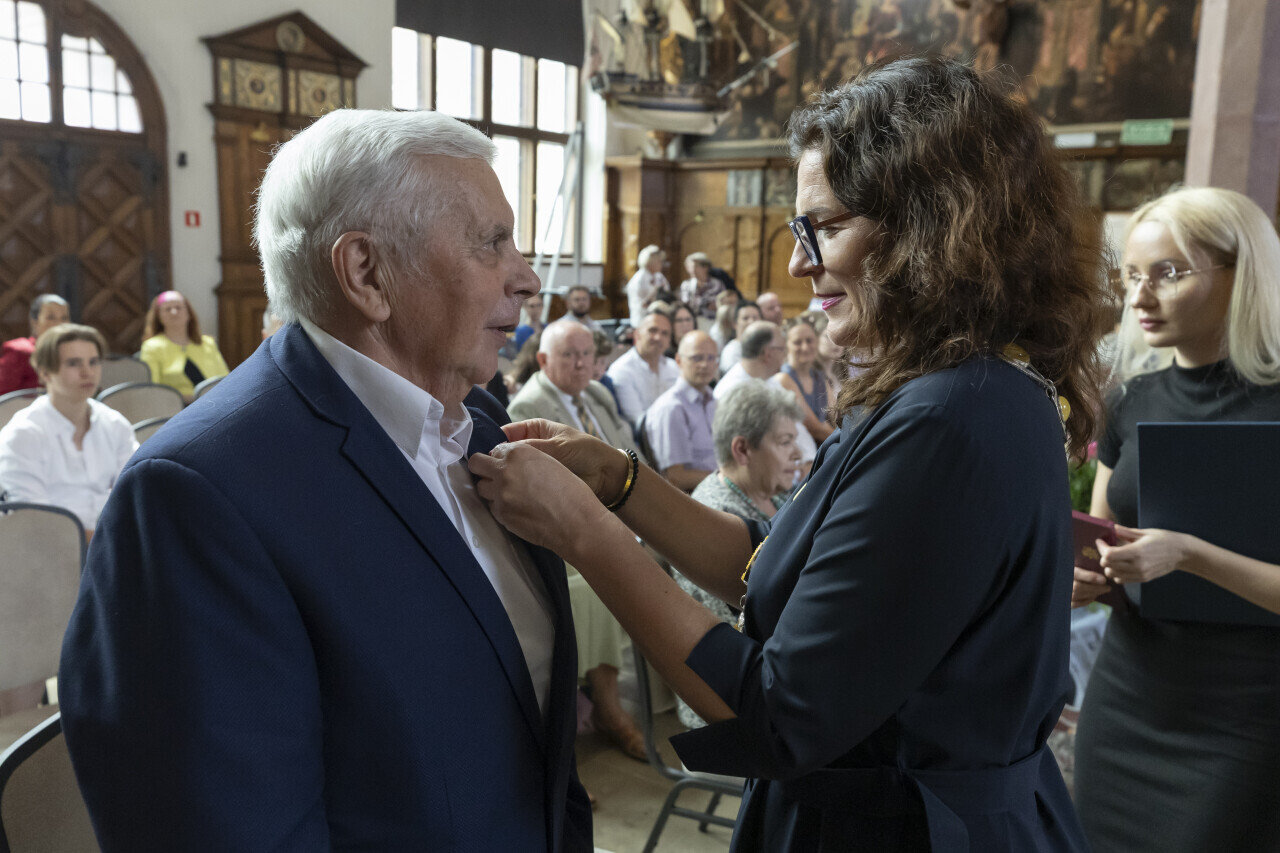 Gdańsk. Dwór Artusa. Jubileusz Par Małżeńskich - Złote Gody, podczas których Prezydent Gdańska Aleksandra Dulkiewicz wręczyła medale za długoletnie pożycie małżeńskie.