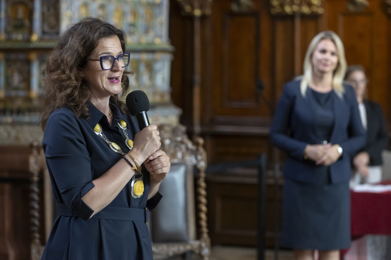 Gdańsk. Dwór Artusa. Jubileusz Par Małżeńskich - Złote Gody, podczas których Prezydent Gdańska Aleksandra Dulkiewicz wręczyła medale za długoletnie pożycie małżeńskie.