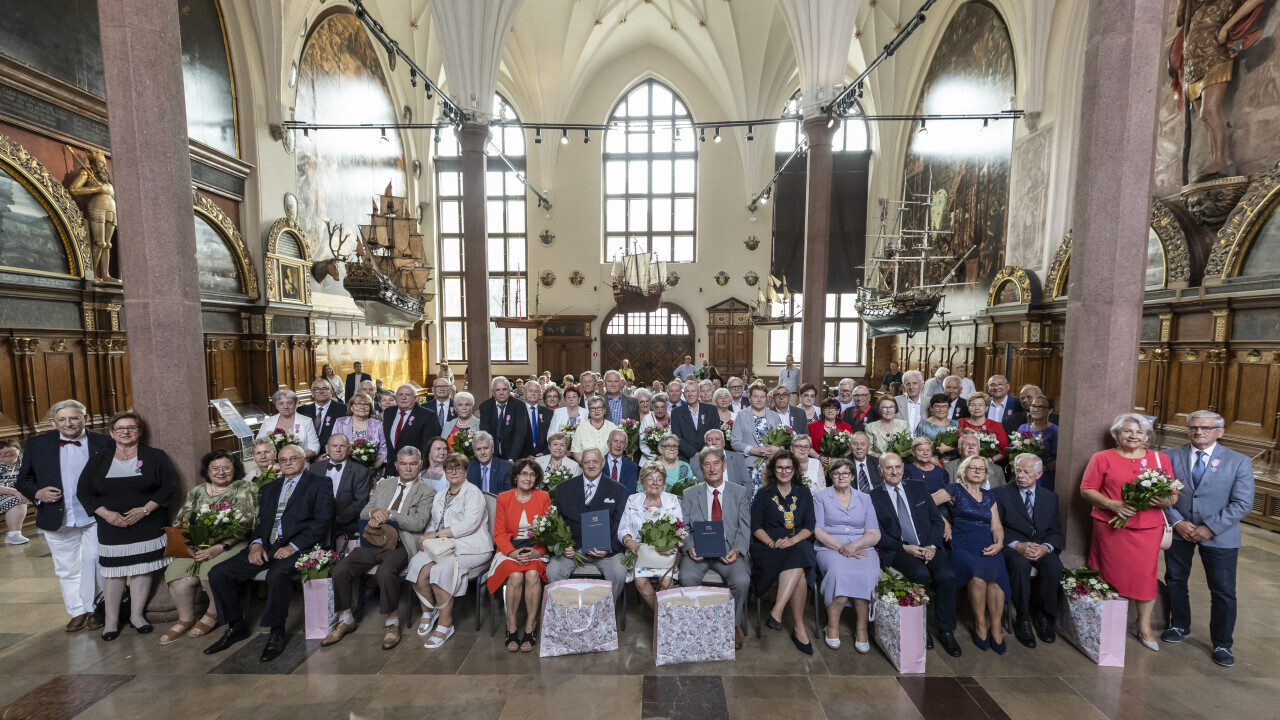 Gdańsk. Dwór Artusa. Jubileusz Par Małżeńskich - Złote Gody, podczas których Prezydent Gdańska Aleksandra Dulkiewicz wręczyła medale za długoletnie pożycie małżeńskie.