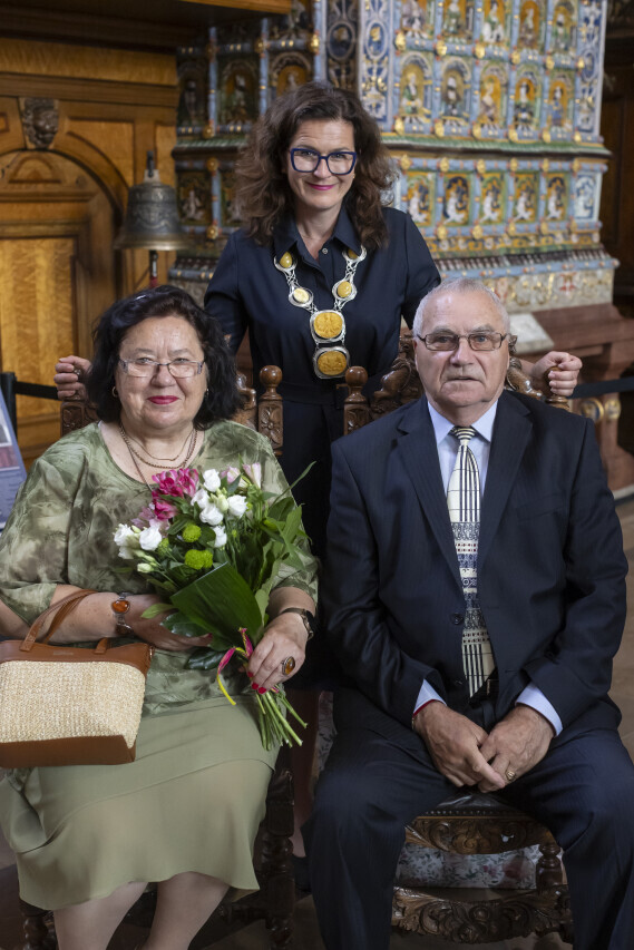 Gdańsk. Dwór Artusa. Jubileusz Par Małżeńskich - Złote Gody, podczas których Prezydent Gdańska Aleksandra Dulkiewicz wręczyła medale za długoletnie pożycie małżeńskie.