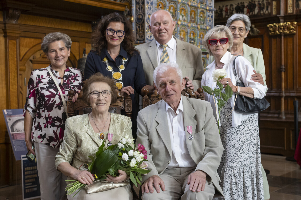 Gdańsk. Dwór Artusa. Jubileusz Par Małżeńskich - Złote Gody, podczas których Prezydent Gdańska Aleksandra Dulkiewicz wręczyła medale za długoletnie pożycie małżeńskie.