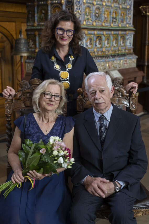 Gdańsk. Dwór Artusa. Jubileusz Par Małżeńskich - Złote Gody, podczas których Prezydent Gdańska Aleksandra Dulkiewicz wręczyła medale za długoletnie pożycie małżeńskie.