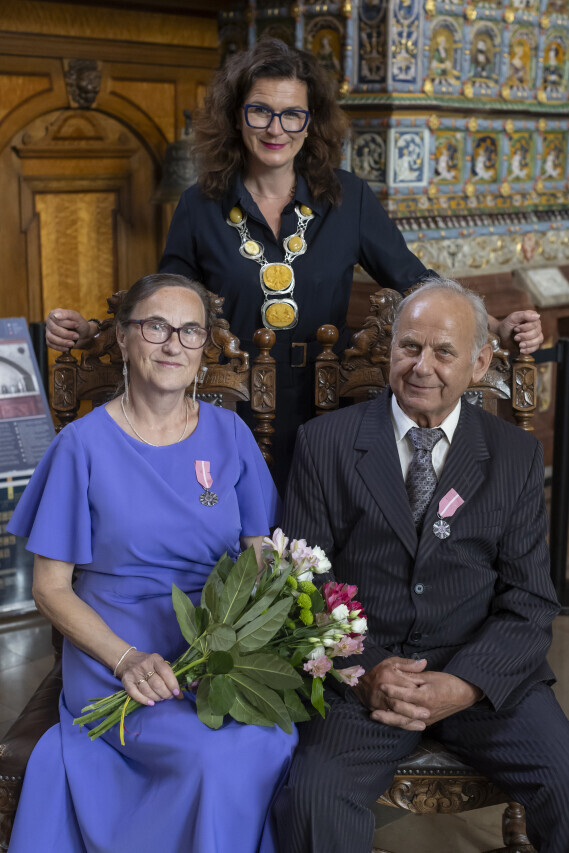 Gdańsk. Dwór Artusa. Jubileusz Par Małżeńskich - Złote Gody, podczas których Prezydent Gdańska Aleksandra Dulkiewicz wręczyła medale za długoletnie pożycie małżeńskie.