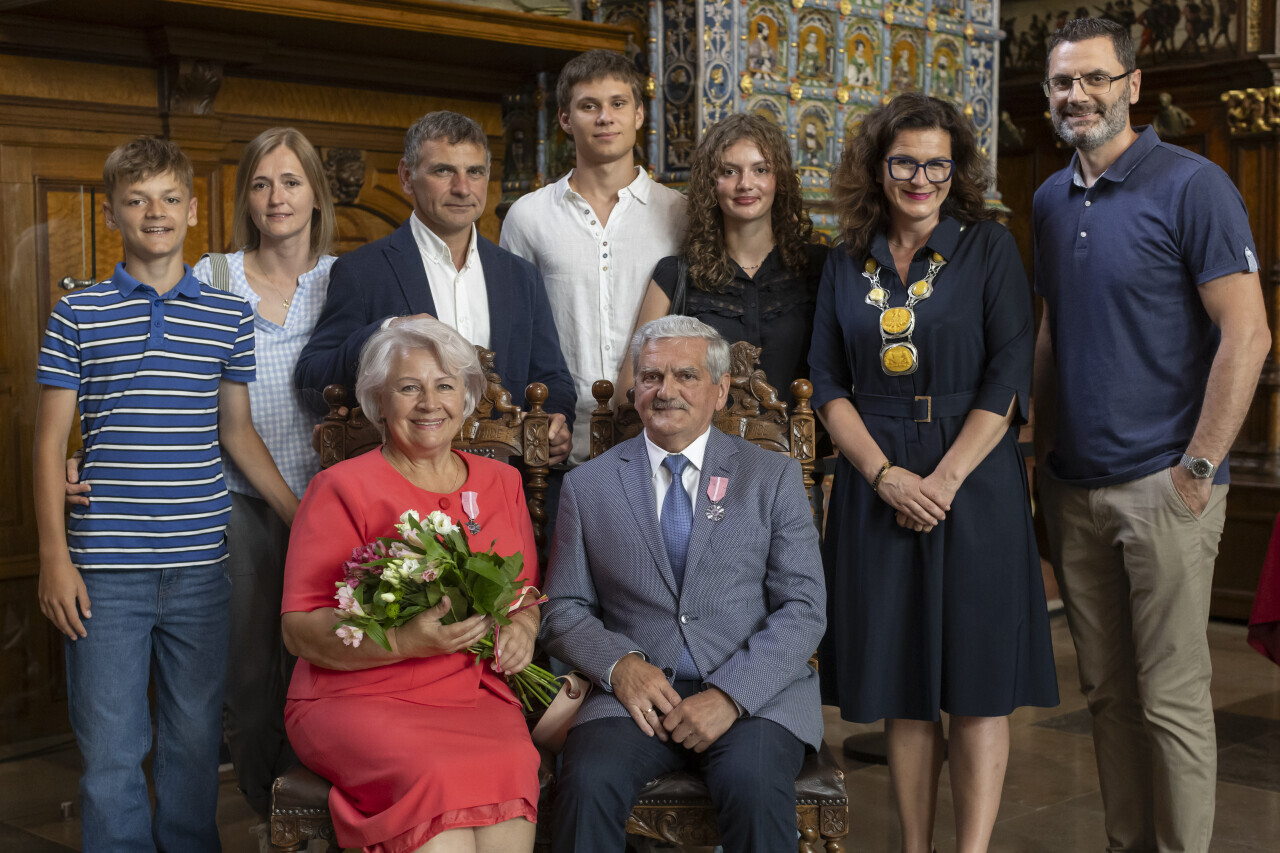 Gdańsk. Dwór Artusa. Jubileusz Par Małżeńskich - Złote Gody, podczas których Prezydent Gdańska Aleksandra Dulkiewicz wręczyła medale za długoletnie pożycie małżeńskie.