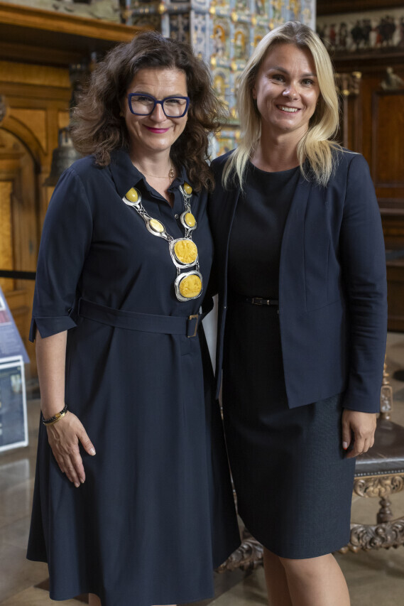 Gdańsk. Dwór Artusa. Jubileusz Par Małżeńskich - Złote Gody, podczas których Prezydent Gdańska Aleksandra Dulkiewicz wręczyła medale za długoletnie pożycie małżeńskie.