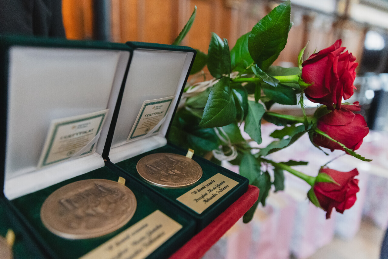 Gdańsk. Dwór Artusa. Jubileusz Par Małżeńskich - Złote Gody, podczas których Prezydent Gdańska Aleksandra Dulkiewicz wręczyła medale za długoletnie pożycie małżeńskie.