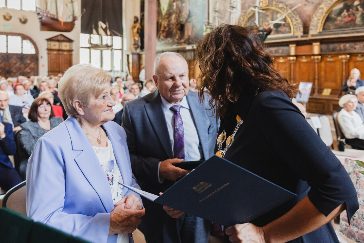 Gdańsk. Dwór Artusa. Jubileusz Par Małżeńskich - Złote Gody, podczas których Prezydent Gdańska Aleksandra Dulkiewicz wręczyła medale za długoletnie pożycie małżeńskie.