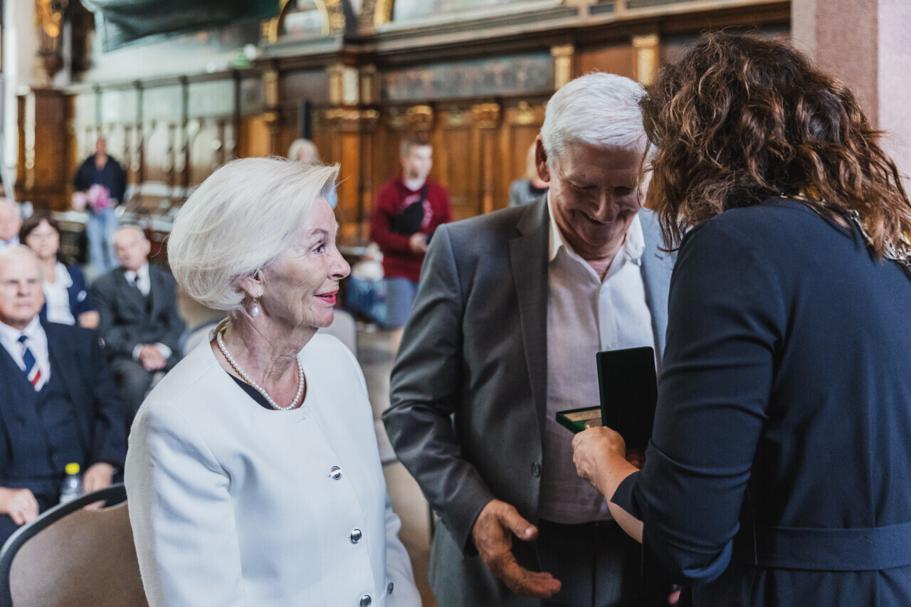 Gdańsk. Dwór Artusa. Jubileusz Par Małżeńskich - Złote Gody, podczas których Prezydent Gdańska Aleksandra Dulkiewicz wręczyła medale za długoletnie pożycie małżeńskie.
