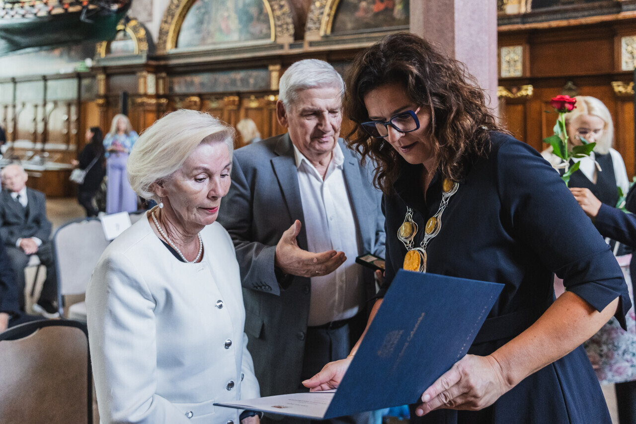 Gdańsk. Dwór Artusa. Jubileusz Par Małżeńskich - Złote Gody, podczas których Prezydent Gdańska Aleksandra Dulkiewicz wręczyła medale za długoletnie pożycie małżeńskie.