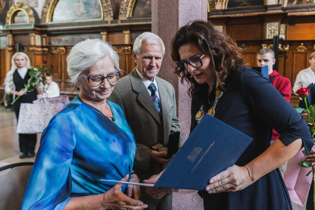 Gdańsk. Dwór Artusa. Jubileusz Par Małżeńskich - Złote Gody, podczas których Prezydent Gdańska Aleksandra Dulkiewicz wręczyła medale za długoletnie pożycie małżeńskie.