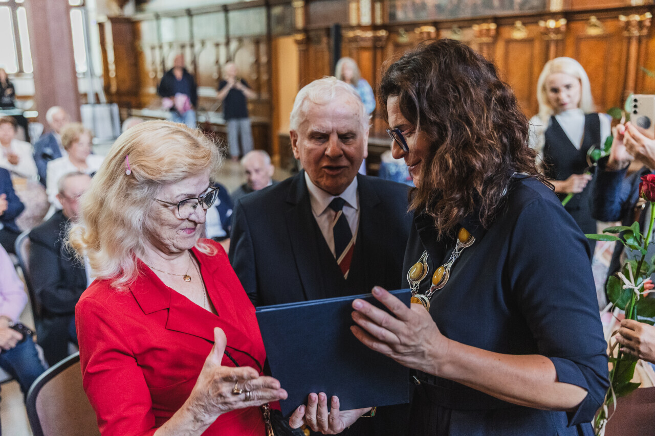 Gdańsk. Dwór Artusa. Jubileusz Par Małżeńskich - Złote Gody, podczas których Prezydent Gdańska Aleksandra Dulkiewicz wręczyła medale za długoletnie pożycie małżeńskie.