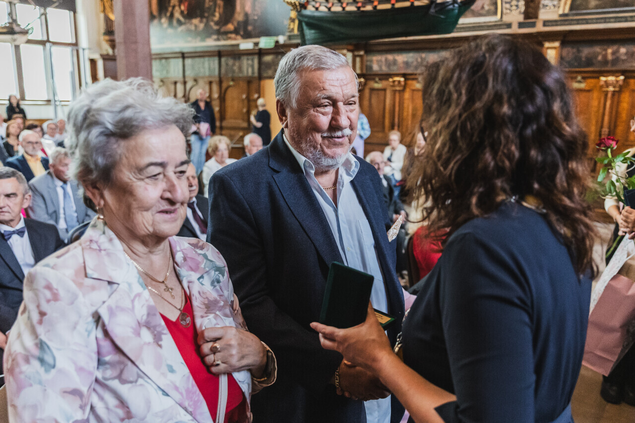 Gdańsk. Dwór Artusa. Jubileusz Par Małżeńskich - Złote Gody, podczas których Prezydent Gdańska Aleksandra Dulkiewicz wręczyła medale za długoletnie pożycie małżeńskie.