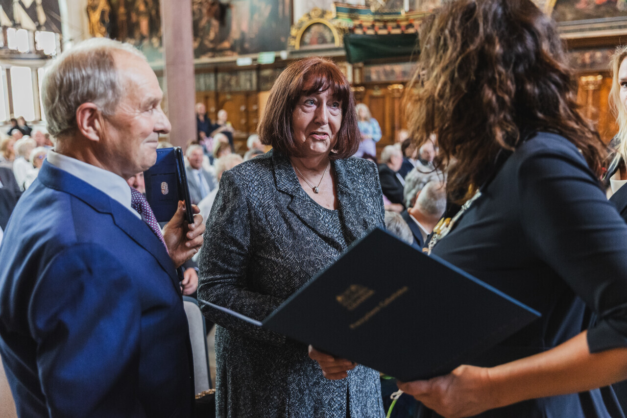 Gdańsk. Dwór Artusa. Jubileusz Par Małżeńskich - Złote Gody, podczas których Prezydent Gdańska Aleksandra Dulkiewicz wręczyła medale za długoletnie pożycie małżeńskie.