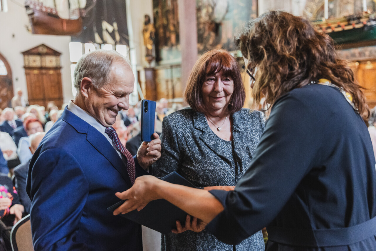 Gdańsk. Dwór Artusa. Jubileusz Par Małżeńskich - Złote Gody, podczas których Prezydent Gdańska Aleksandra Dulkiewicz wręczyła medale za długoletnie pożycie małżeńskie.