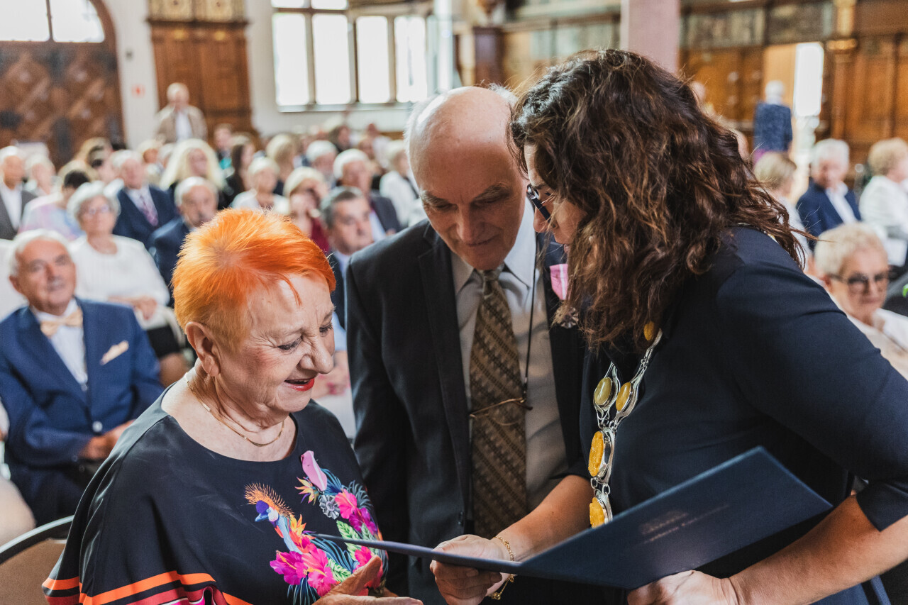 Gdańsk. Dwór Artusa. Jubileusz Par Małżeńskich - Złote Gody, podczas których Prezydent Gdańska Aleksandra Dulkiewicz wręczyła medale za długoletnie pożycie małżeńskie.