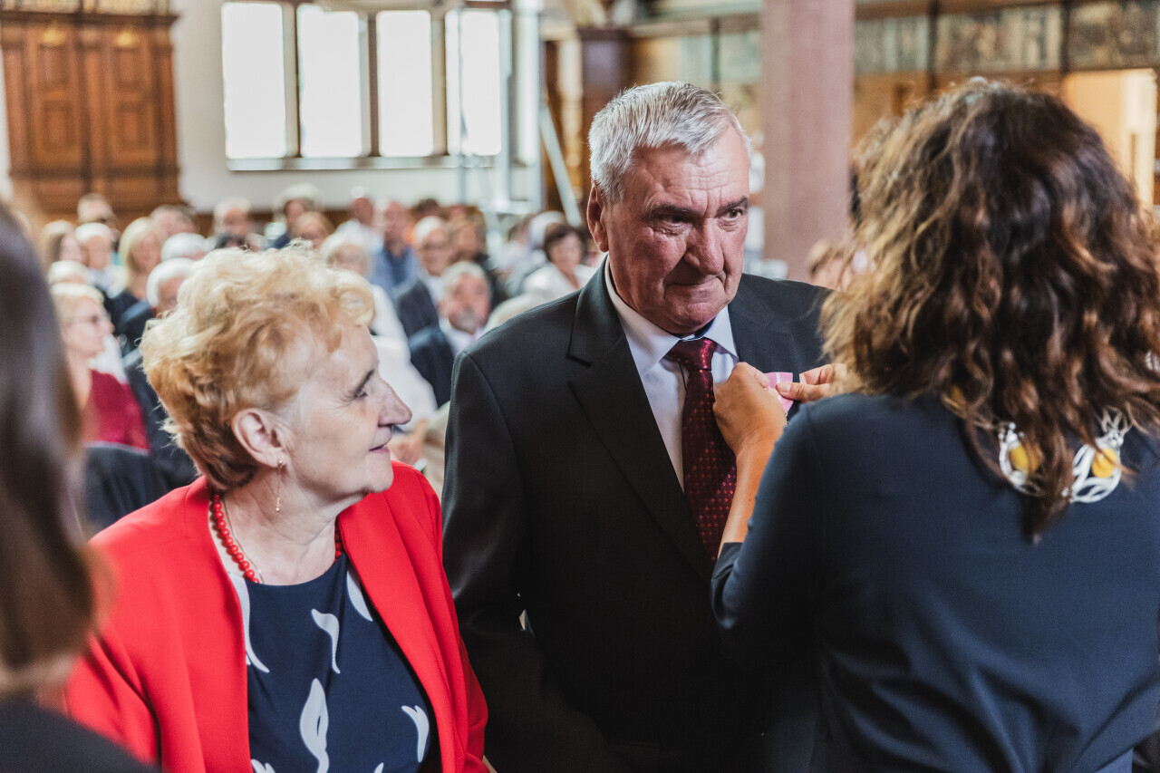 Gdańsk. Dwór Artusa. Jubileusz Par Małżeńskich - Złote Gody, podczas których Prezydent Gdańska Aleksandra Dulkiewicz wręczyła medale za długoletnie pożycie małżeńskie.