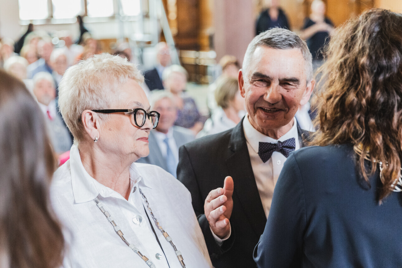 Gdańsk. Dwór Artusa. Jubileusz Par Małżeńskich - Złote Gody, podczas których Prezydent Gdańska Aleksandra Dulkiewicz wręczyła medale za długoletnie pożycie małżeńskie.