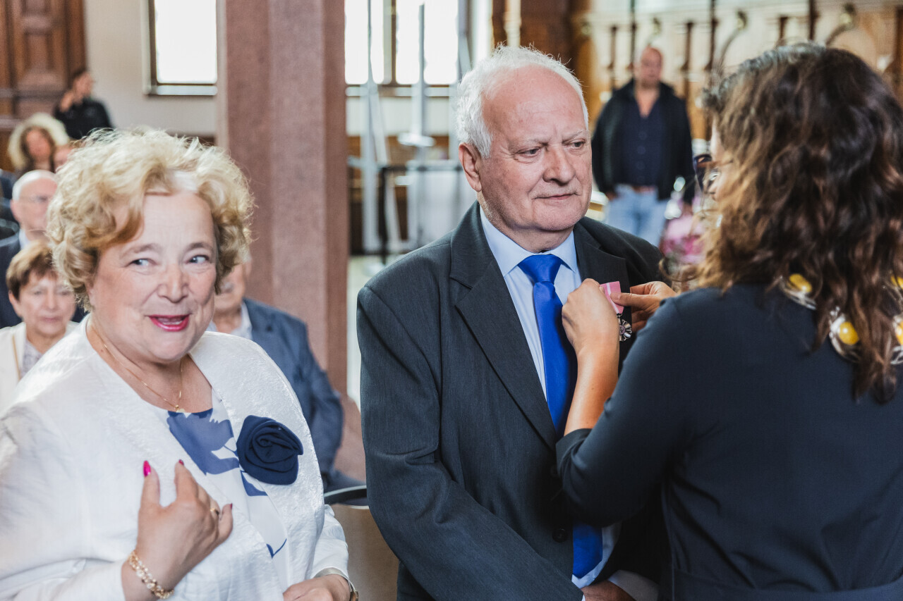 Gdańsk. Dwór Artusa. Jubileusz Par Małżeńskich - Złote Gody, podczas których Prezydent Gdańska Aleksandra Dulkiewicz wręczyła medale za długoletnie pożycie małżeńskie.