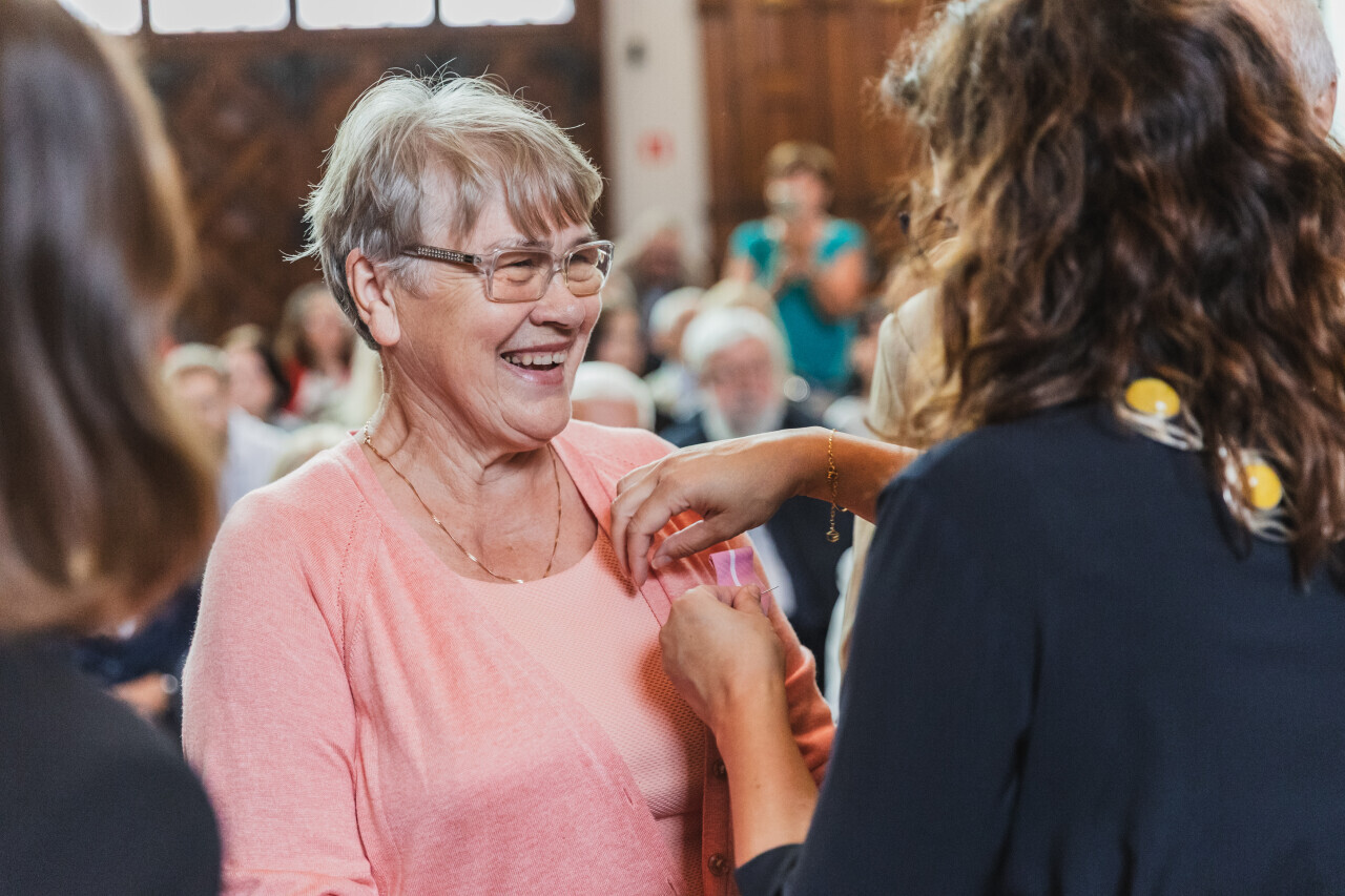 Gdańsk. Dwór Artusa. Jubileusz Par Małżeńskich - Złote Gody, podczas których Prezydent Gdańska Aleksandra Dulkiewicz wręczyła medale za długoletnie pożycie małżeńskie.