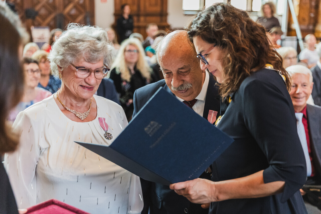 Gdańsk. Dwór Artusa. Jubileusz Par Małżeńskich - Złote Gody, podczas których Prezydent Gdańska Aleksandra Dulkiewicz wręczyła medale za długoletnie pożycie małżeńskie.