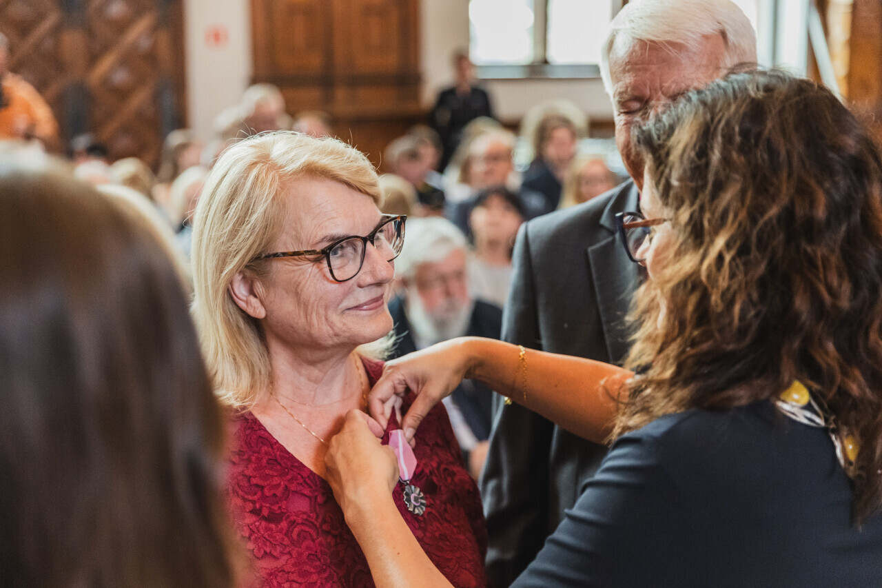 Gdańsk. Dwór Artusa. Jubileusz Par Małżeńskich - Złote Gody, podczas których Prezydent Gdańska Aleksandra Dulkiewicz wręczyła medale za długoletnie pożycie małżeńskie.