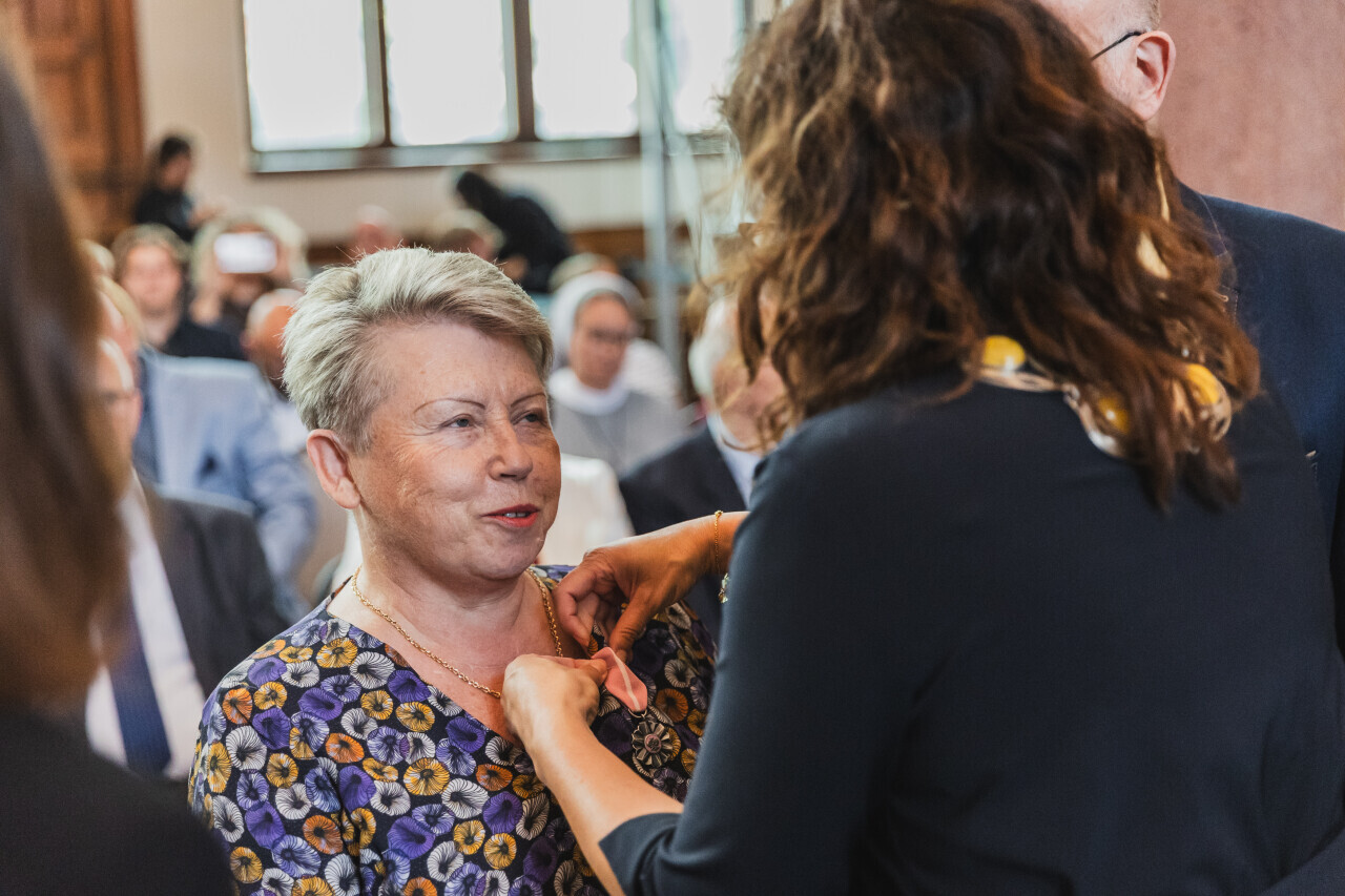 Gdańsk. Dwór Artusa. Jubileusz Par Małżeńskich - Złote Gody, podczas których Prezydent Gdańska Aleksandra Dulkiewicz wręczyła medale za długoletnie pożycie małżeńskie.