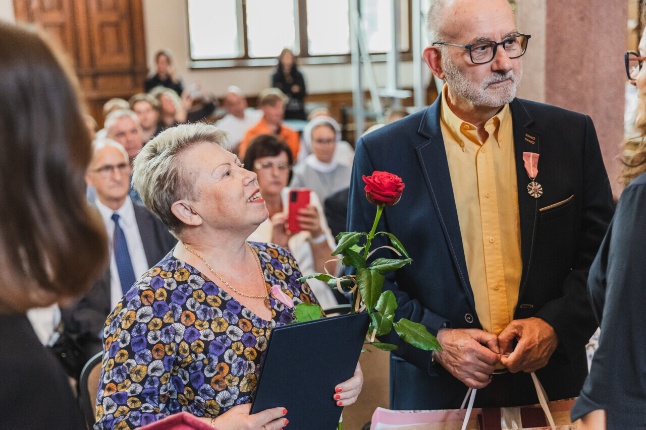 Gdańsk. Dwór Artusa. Jubileusz Par Małżeńskich - Złote Gody, podczas których Prezydent Gdańska Aleksandra Dulkiewicz wręczyła medale za długoletnie pożycie małżeńskie.