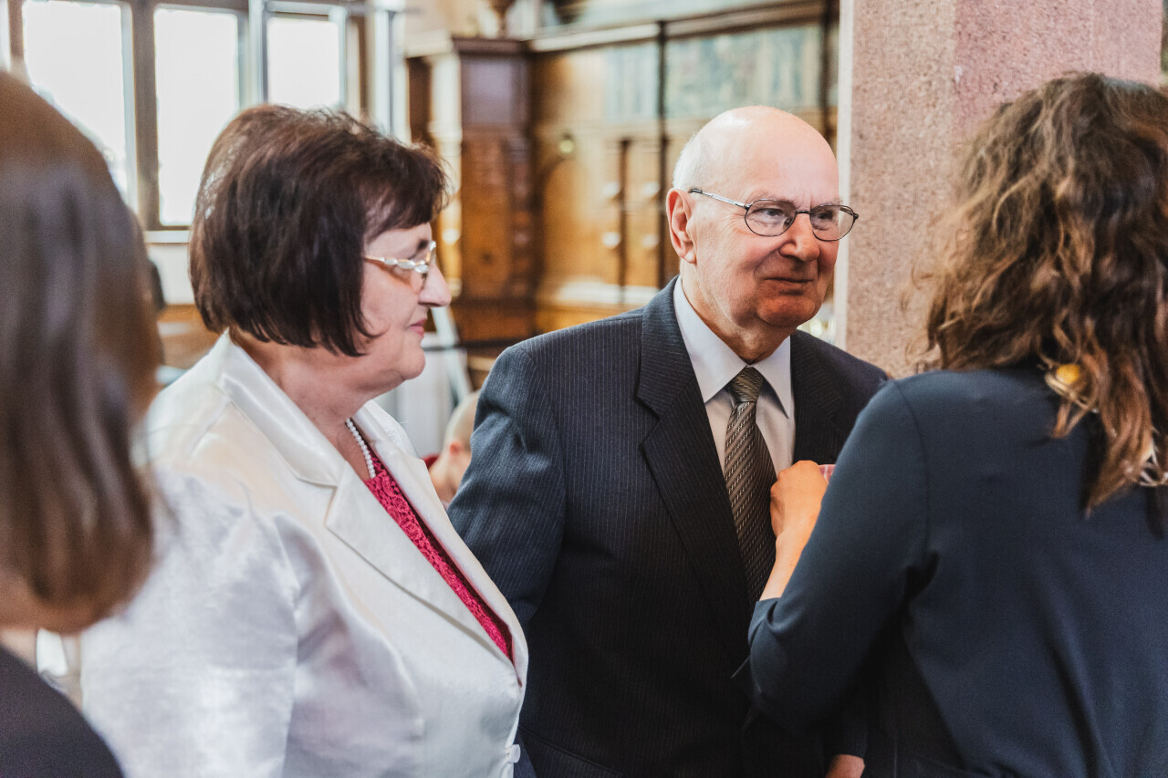 Gdańsk. Dwór Artusa. Jubileusz Par Małżeńskich - Złote Gody, podczas których Prezydent Gdańska Aleksandra Dulkiewicz wręczyła medale za długoletnie pożycie małżeńskie.