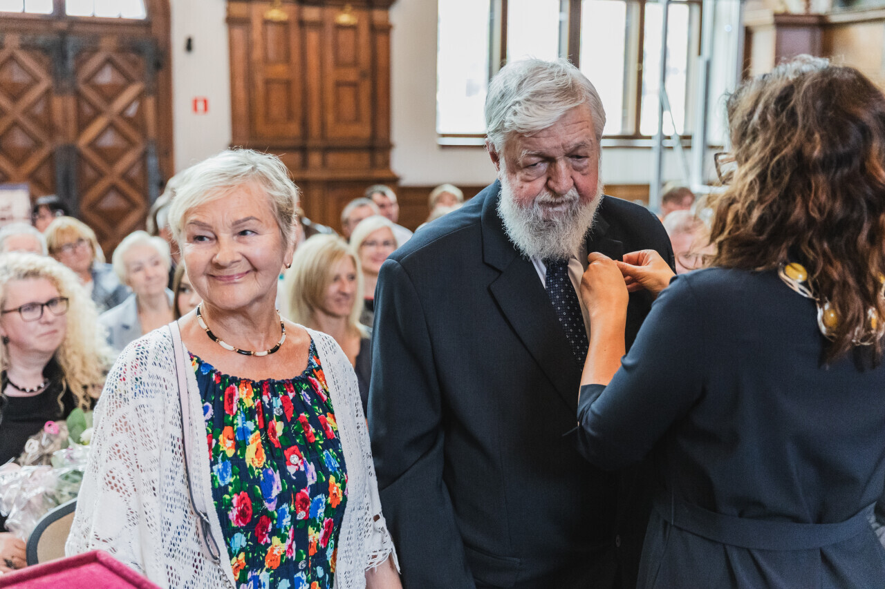 Gdańsk. Dwór Artusa. Jubileusz Par Małżeńskich - Złote Gody, podczas których Prezydent Gdańska Aleksandra Dulkiewicz wręczyła medale za długoletnie pożycie małżeńskie.