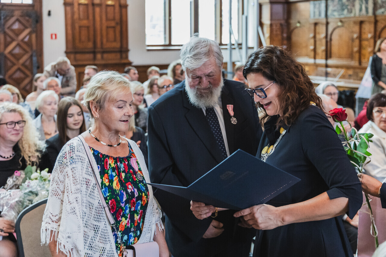 Gdańsk. Dwór Artusa. Jubileusz Par Małżeńskich - Złote Gody, podczas których Prezydent Gdańska Aleksandra Dulkiewicz wręczyła medale za długoletnie pożycie małżeńskie.
