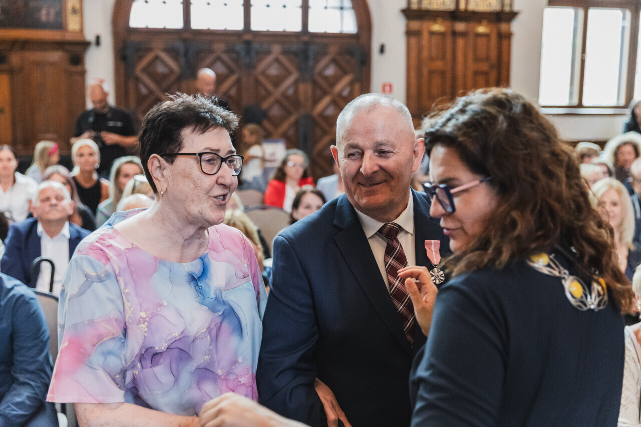 Gdańsk. Dwór Artusa. Jubileusz Par Małżeńskich - Złote Gody, podczas których Prezydent Gdańska Aleksandra Dulkiewicz wręczyła medale za długoletnie pożycie małżeńskie.
