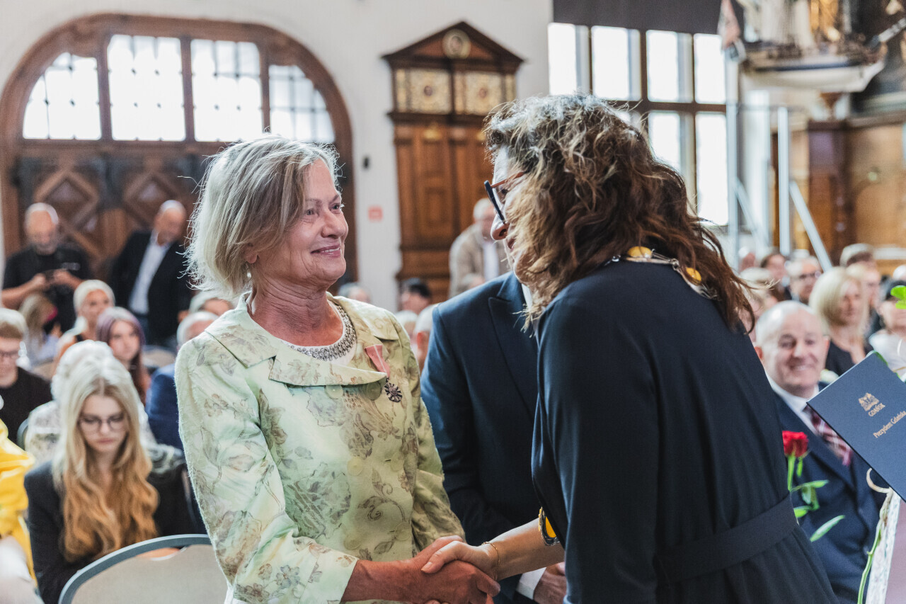 Gdańsk. Dwór Artusa. Jubileusz Par Małżeńskich - Złote Gody, podczas których Prezydent Gdańska Aleksandra Dulkiewicz wręczyła medale za długoletnie pożycie małżeńskie.