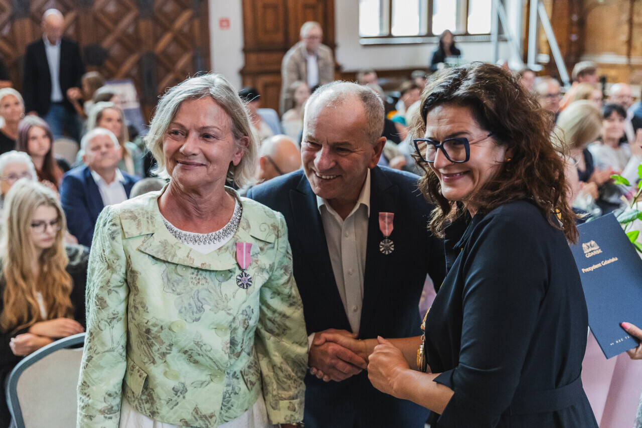 Gdańsk. Dwór Artusa. Jubileusz Par Małżeńskich - Złote Gody, podczas których Prezydent Gdańska Aleksandra Dulkiewicz wręczyła medale za długoletnie pożycie małżeńskie.