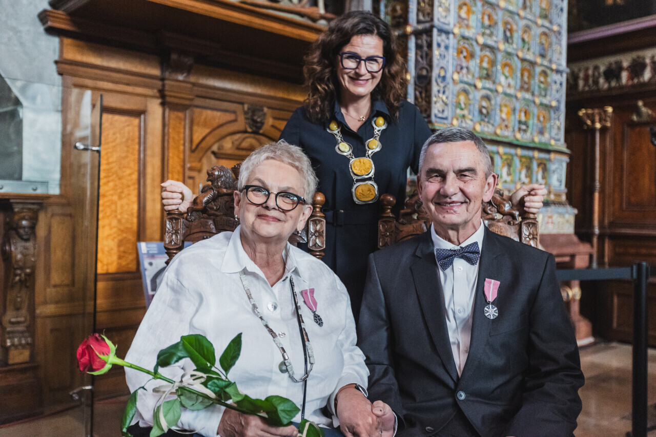Gdańsk. Dwór Artusa. Jubileusz Par Małżeńskich - Złote Gody, podczas których Prezydent Gdańska Aleksandra Dulkiewicz wręczyła medale za długoletnie pożycie małżeńskie.