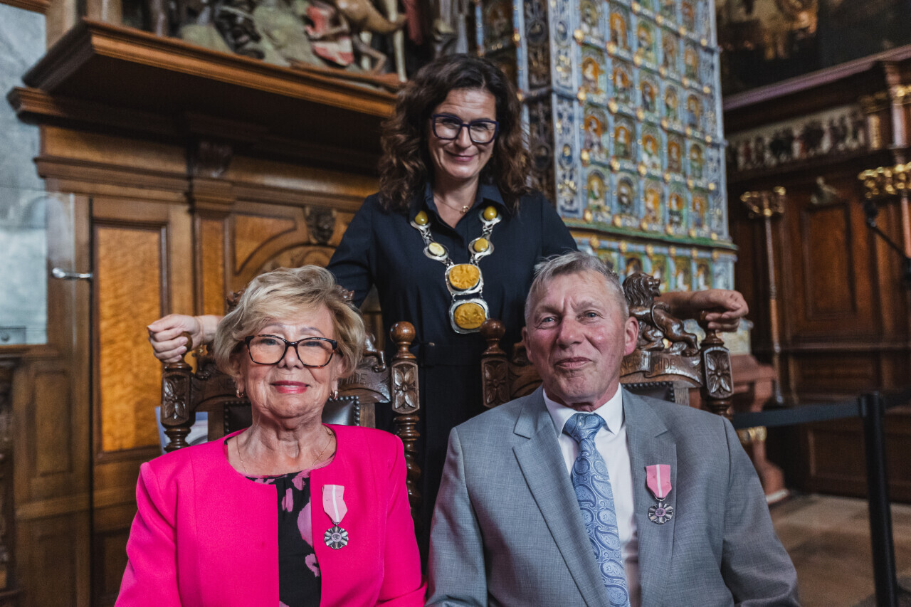Gdańsk. Dwór Artusa. Jubileusz Par Małżeńskich - Złote Gody, podczas których Prezydent Gdańska Aleksandra Dulkiewicz wręczyła medale za długoletnie pożycie małżeńskie.