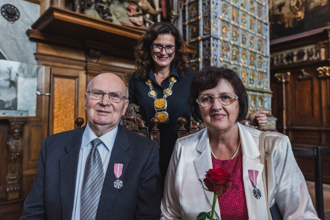 Gdańsk. Dwór Artusa. Jubileusz Par Małżeńskich - Złote Gody, podczas których Prezydent Gdańska Aleksandra Dulkiewicz wręczyła medale za długoletnie pożycie małżeńskie.