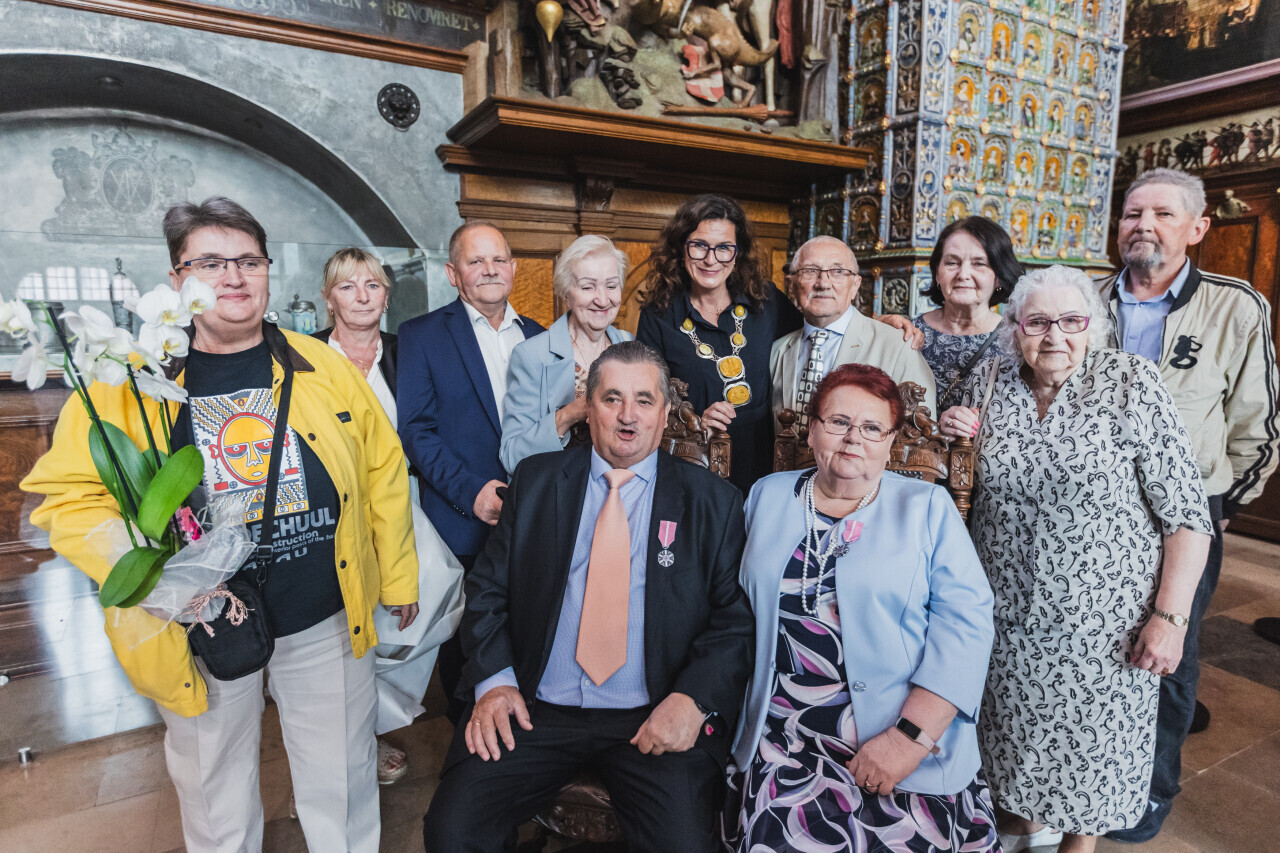 Gdańsk. Dwór Artusa. Jubileusz Par Małżeńskich - Złote Gody, podczas których Prezydent Gdańska Aleksandra Dulkiewicz wręczyła medale za długoletnie pożycie małżeńskie.