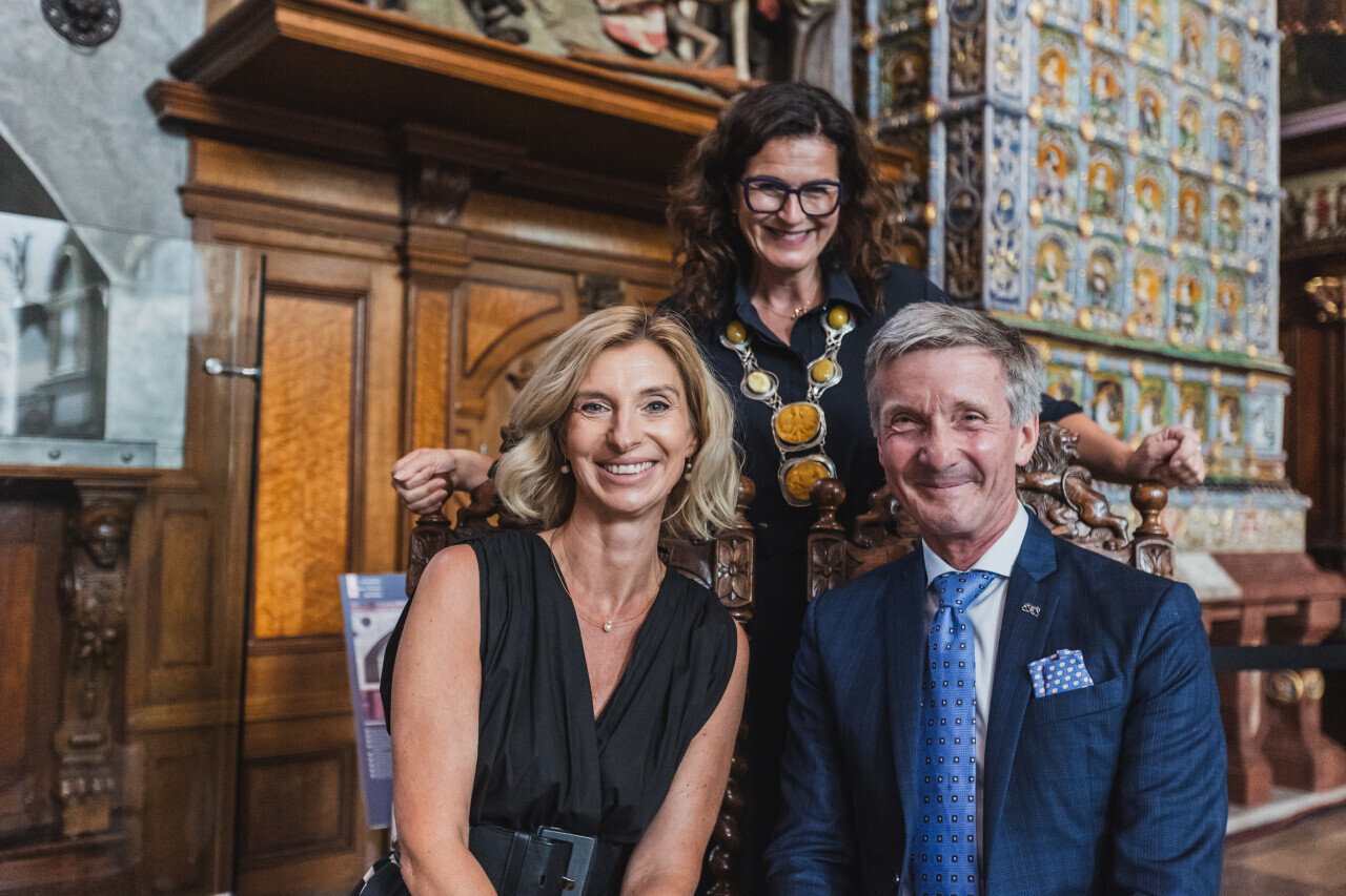 Gdańsk. Dwór Artusa. Jubileusz Par Małżeńskich - Złote Gody, podczas których Prezydent Gdańska Aleksandra Dulkiewicz wręczyła medale za długoletnie pożycie małżeńskie.