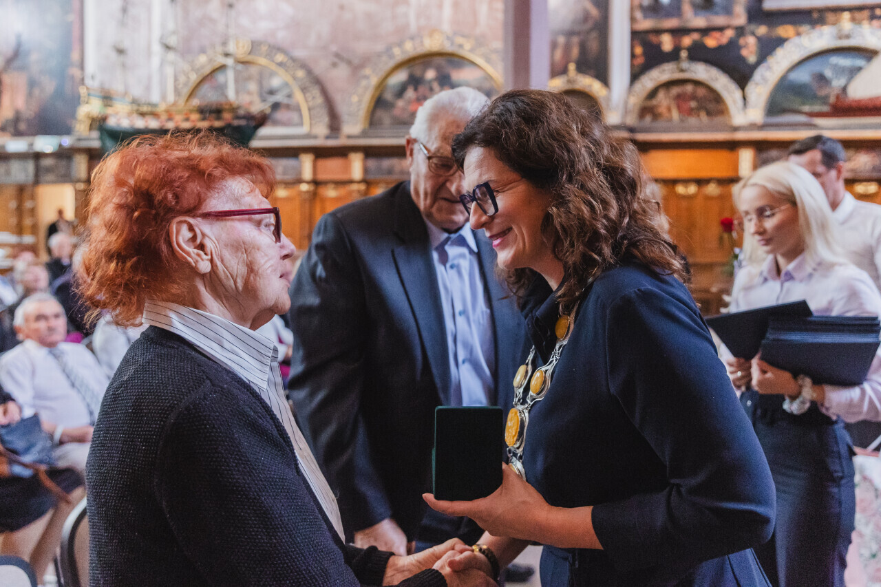 Gdańsk. Dwór Artusa. Jubileusz Par Małżeńskich - Złote Gody, podczas których Prezydent Gdańska Aleksandra Dulkiewicz wręczyła medale za długoletnie pożycie małżeńskie.