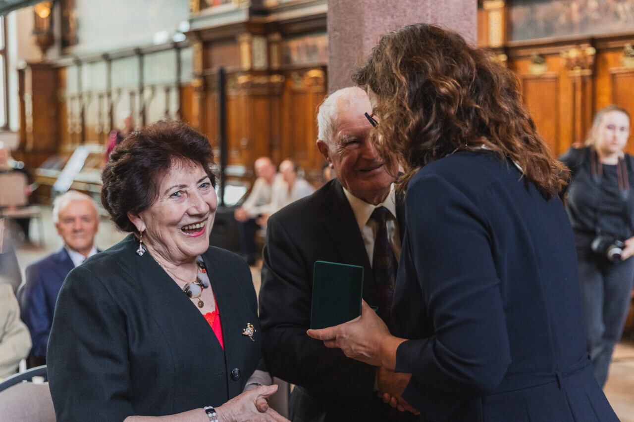 Gdańsk. Dwór Artusa. Jubileusz Par Małżeńskich - Złote Gody, podczas których Prezydent Gdańska Aleksandra Dulkiewicz wręczyła medale za długoletnie pożycie małżeńskie.