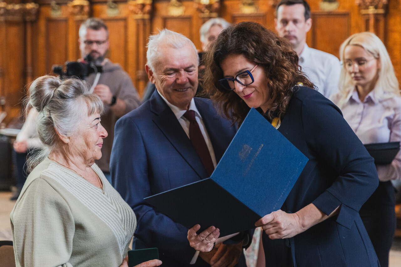 Gdańsk. Dwór Artusa. Jubileusz Par Małżeńskich - Złote Gody, podczas których Prezydent Gdańska Aleksandra Dulkiewicz wręczyła medale za długoletnie pożycie małżeńskie.