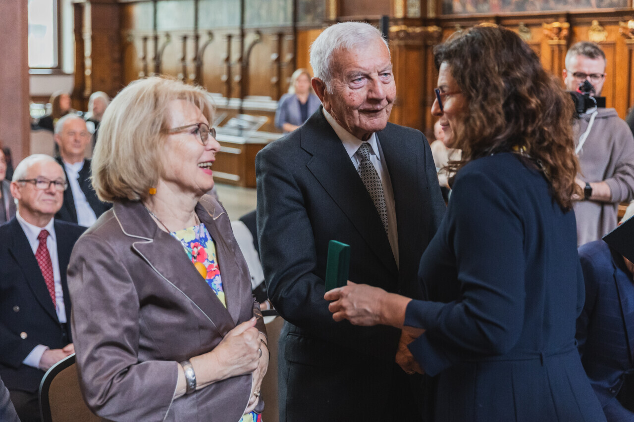 Gdańsk. Dwór Artusa. Jubileusz Par Małżeńskich - Złote Gody, podczas których Prezydent Gdańska Aleksandra Dulkiewicz wręczyła medale za długoletnie pożycie małżeńskie.