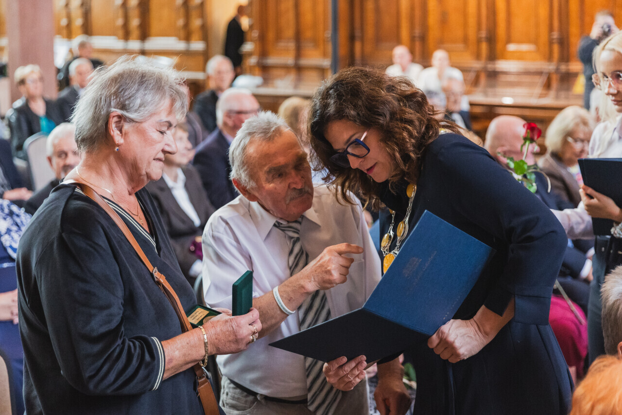 Gdańsk. Dwór Artusa. Jubileusz Par Małżeńskich - Złote Gody, podczas których Prezydent Gdańska Aleksandra Dulkiewicz wręczyła medale za długoletnie pożycie małżeńskie.