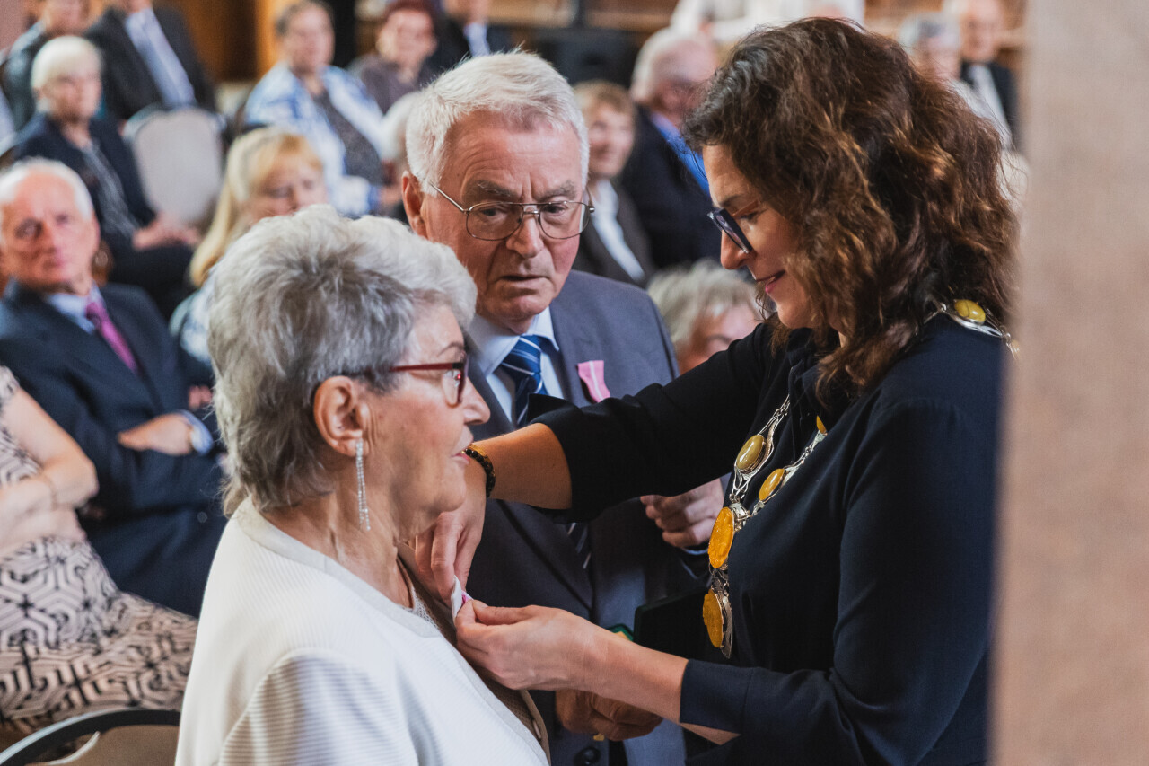 Gdańsk. Dwór Artusa. Jubileusz Par Małżeńskich - Złote Gody, podczas których Prezydent Gdańska Aleksandra Dulkiewicz wręczyła medale za długoletnie pożycie małżeńskie.