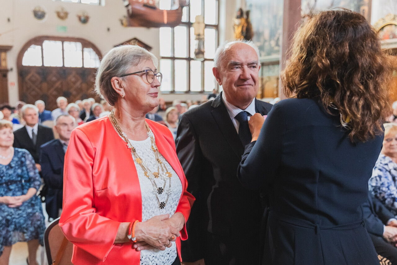 Gdańsk. Dwór Artusa. Jubileusz Par Małżeńskich - Złote Gody, podczas których Prezydent Gdańska Aleksandra Dulkiewicz wręczyła medale za długoletnie pożycie małżeńskie.