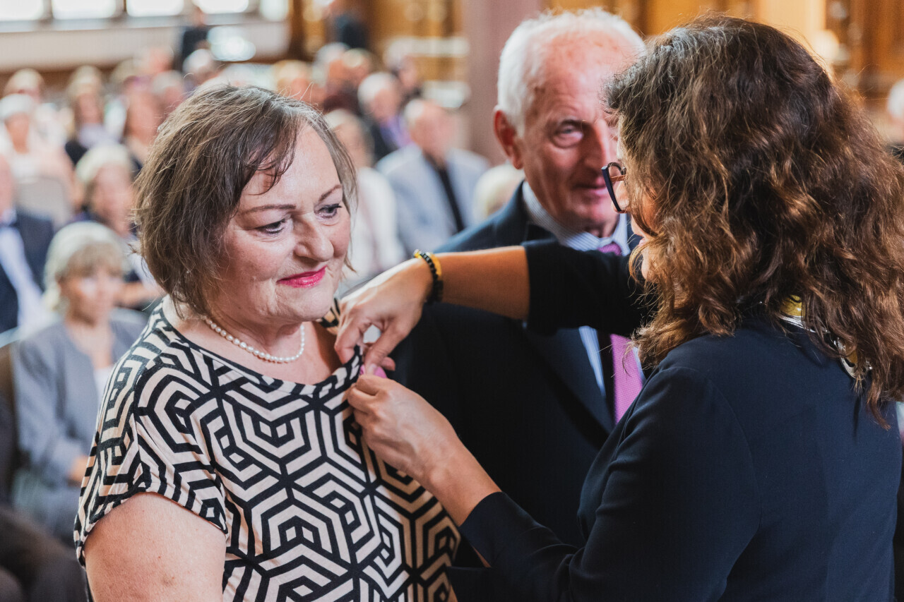Gdańsk. Dwór Artusa. Jubileusz Par Małżeńskich - Złote Gody, podczas których Prezydent Gdańska Aleksandra Dulkiewicz wręczyła medale za długoletnie pożycie małżeńskie.