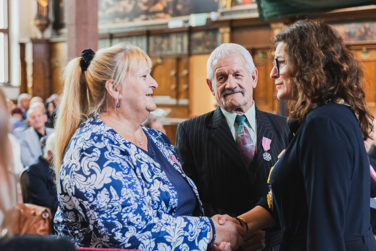 Gdańsk. Dwór Artusa. Jubileusz Par Małżeńskich - Złote Gody, podczas których Prezydent Gdańska Aleksandra Dulkiewicz wręczyła medale za długoletnie pożycie małżeńskie.