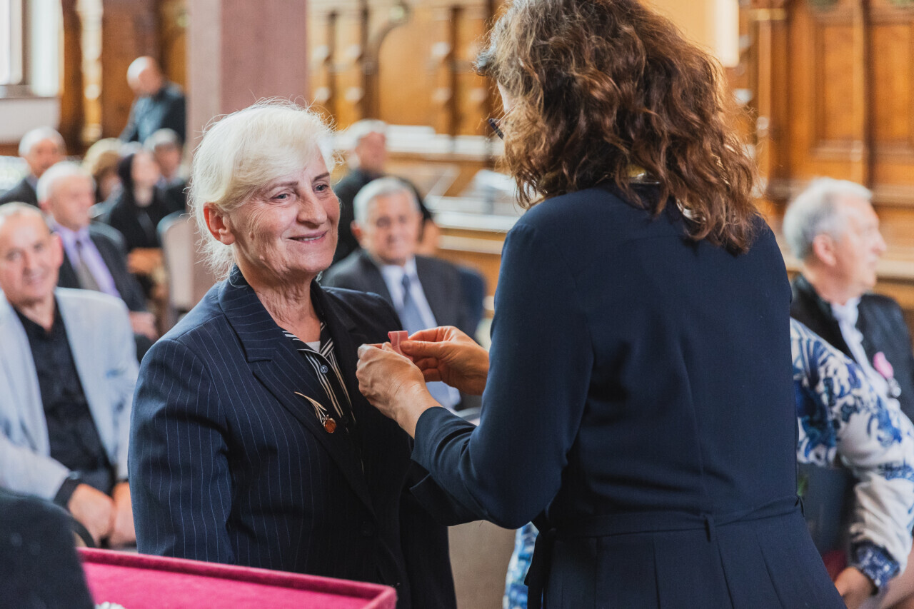 Gdańsk. Dwór Artusa. Jubileusz Par Małżeńskich - Złote Gody, podczas których Prezydent Gdańska Aleksandra Dulkiewicz wręczyła medale za długoletnie pożycie małżeńskie.