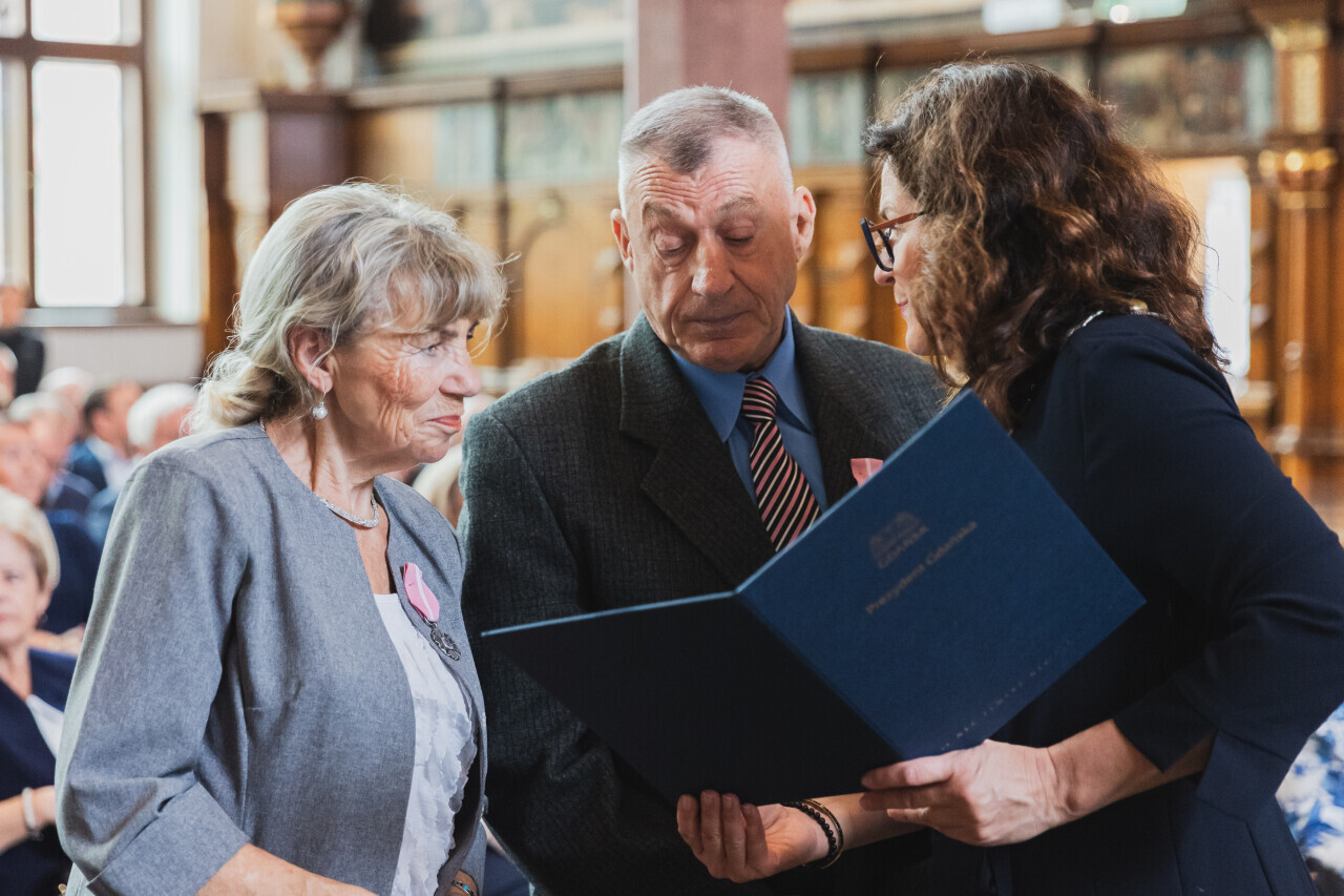 Gdańsk. Dwór Artusa. Jubileusz Par Małżeńskich - Złote Gody, podczas których Prezydent Gdańska Aleksandra Dulkiewicz wręczyła medale za długoletnie pożycie małżeńskie.
